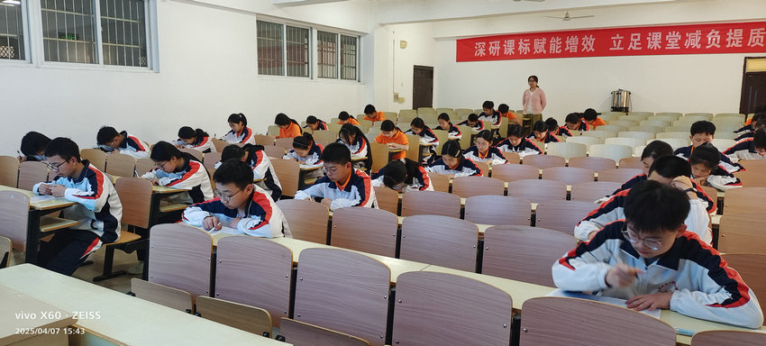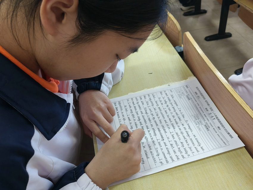 比赛要求学生在40分钟内完成一篇紧扣主题、结构清晰、语言流畅的英语作文。赛场上,同学们认真审题、凝神构思,时而伏案疾书,时而停笔沉思,将平日积累的词汇、语法和表达技巧灵活运用,用文字传递思想,用英语书写青春。