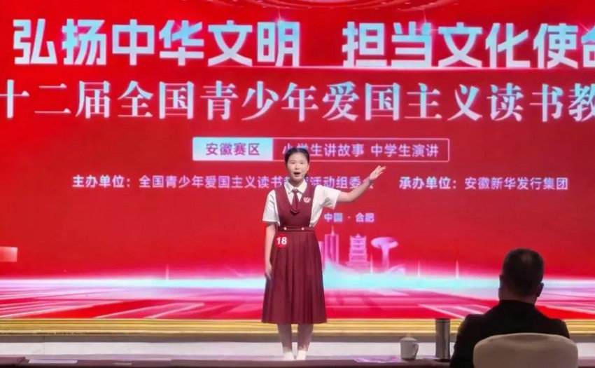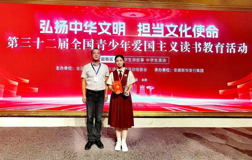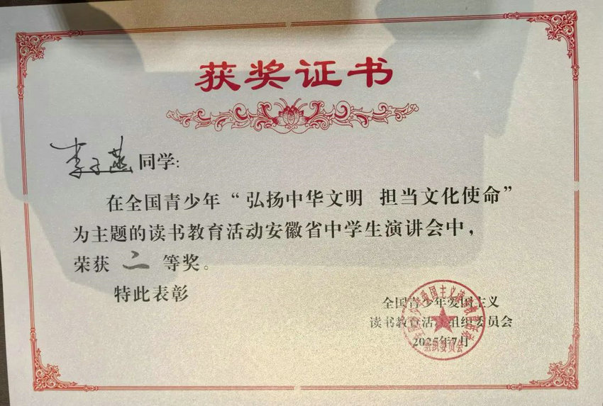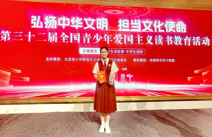 7月16-18日,在合肥举办的第三十二届全国青少年“弘扬中华文明,担当文化使命”为主题的读书教育活动安徽省中学生演讲比赛中,我校初中部李子菡同学凭借出色的表现,荣获二等奖!