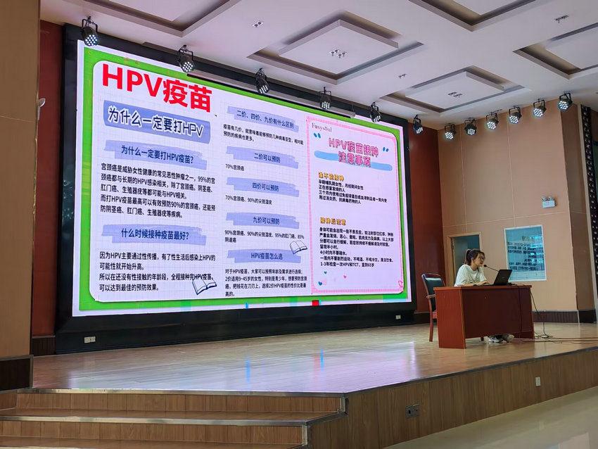 女生讲座中特别引入hpv疫苗相关知识,介绍接种hpv疫苗对预防宫颈癌等疾病的重要意义,包括二价、四价、九价疫苗的区别,最佳接种时间及接种注意事项等,引导女生树立健康防护意识。