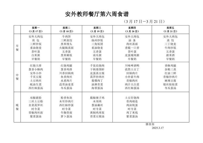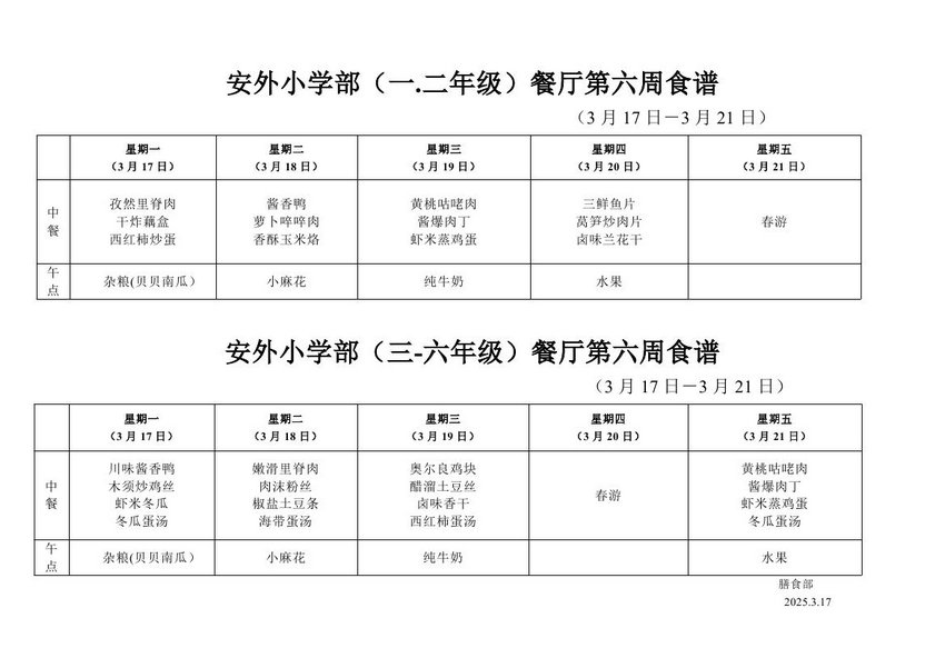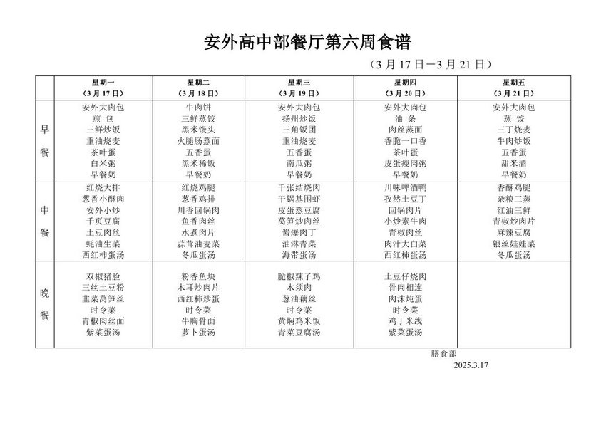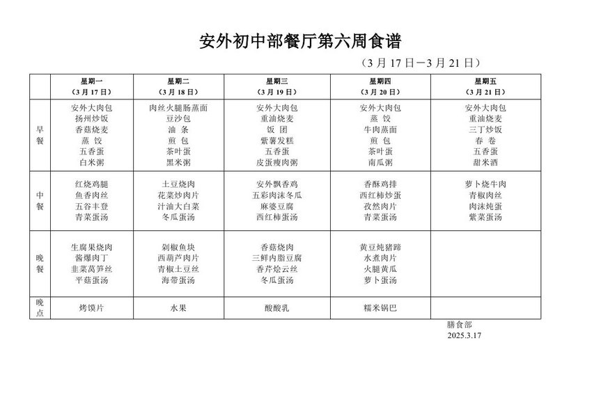 2024-2025学年度第二学期第六周食谱