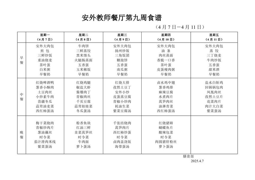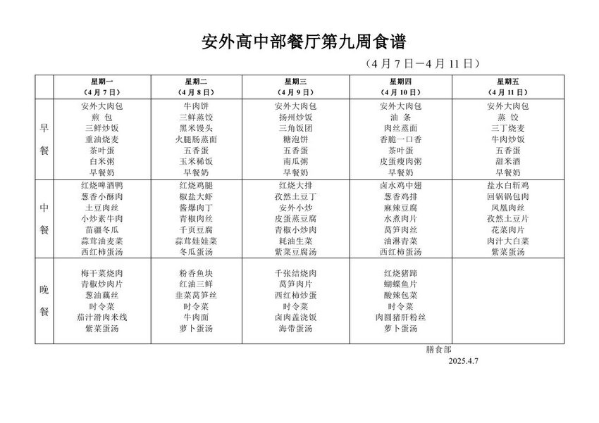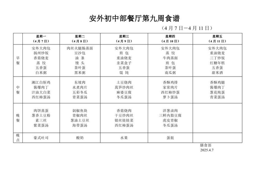 2024-2025学年度第二学期第九周食谱