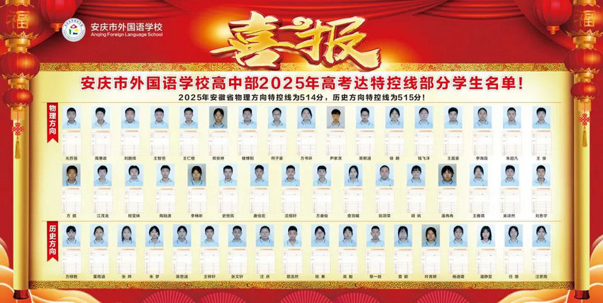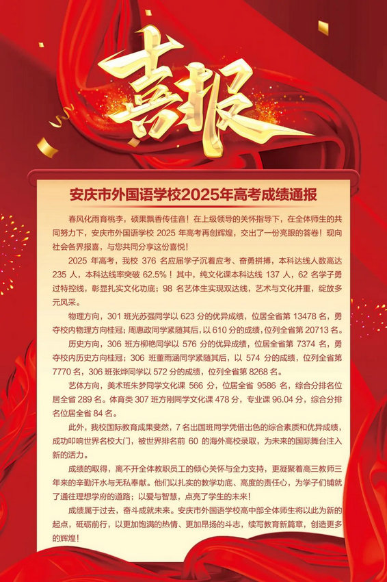 答:2025年高考,我校应届高考学生376人,本科达线人数为235人,达线率为62.5%,纯文化课本科达线137人,过特控线62人,艺体生双达线98人。其中物理方向最高分光苏强同学623分(三年前中考627分),全省排名13478,第二名周惠政同学610分(三年前中考658分),全省排名20713名。另外,有7名出国班同学成功升入世界排名前60名校。同时,学生在各级各类学科竞赛、外语大赛、科创比赛以及文体活动中都取得了优异成绩,充分展现了学校的教育教学成效,也赢得了广大家长和社会的高度认可。